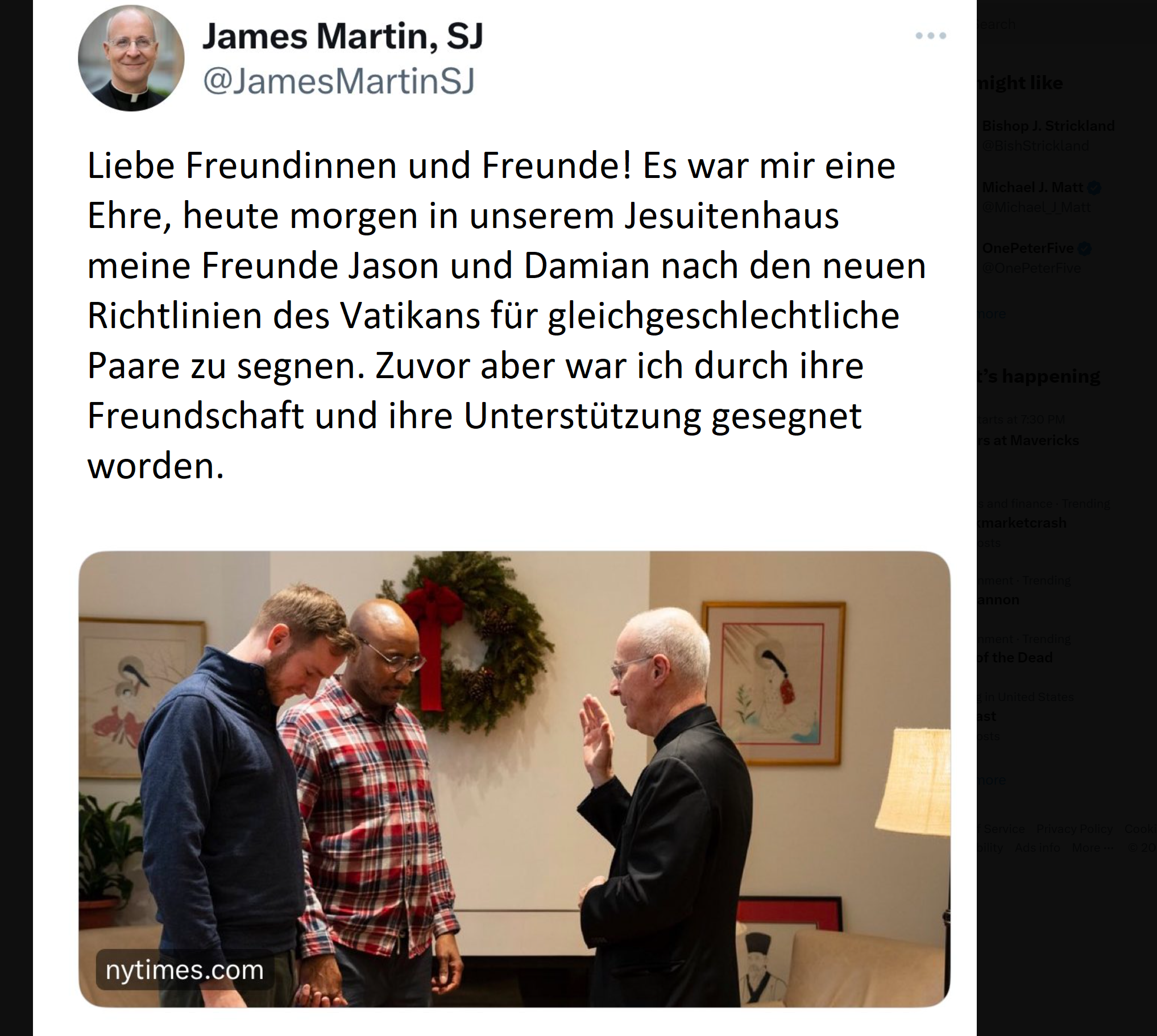 Man will nicht, dass jemand von Homosexuellen verlangt, ihren sündhaften Lebensstil aufzugeben. Das ist auch der Grund, weshalb Franziskus pro-„LGBT“-Aktivisten wie „Pater“ James Martin nicht verurteilt, sondern sie im Gegenteil gutheißt. Und tatsächlich: Nachdem Fiducia Supplicans veröffentlicht wurde, benutzte James Martin es, um zwei Homosexuelle zu „segnen“, die behaupteten, „verheiratet“ zu sein.